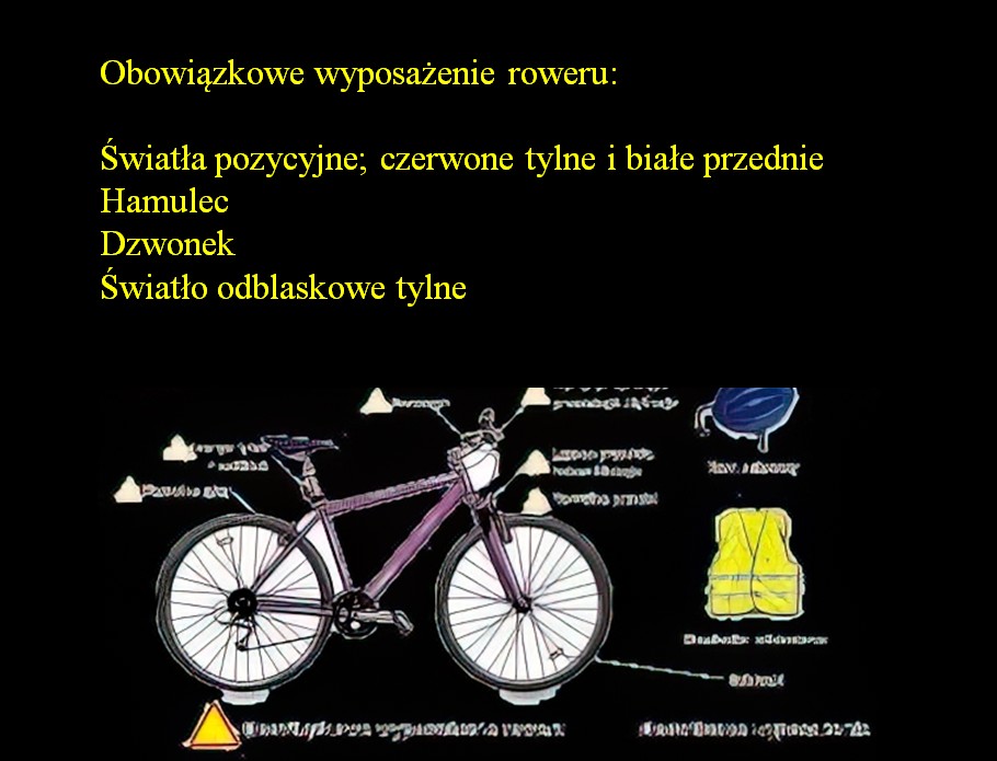 Pamiętajmy tez o obowiązkowym wyposażeniu roweru głównie o jego widoczności. Obowiązkowe jest posiadanie świateł przednich białych i tylnego czerwonego wraz z odblaskiem tylnym. Rower musi mieć sprawne hamulce – minimum jeden oraz być wyposażony w dzwonek tak jak samochody w klakson.