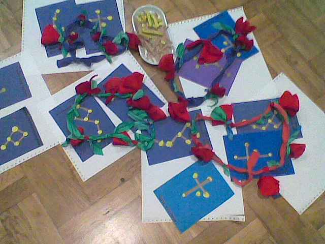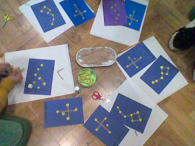 Opuściliśmy Amerykę i skierowaliśmy się dzisiaj ku wyspom na Pacyfiku. Polinezyjczycy mieszkańcy tych wysp byli doskonałymi żeglarzami. W orietacji na morzu nocą pozwalała im znajomość gwiazd. Wykonywali oni mapy nieba z gałązek i muszelek. My starając się podążyć za nimi wykonaliśmy podobną metodą (zastepując muszelki i gałązki innymi materiałami) mapy dwóch gwiazdozbiorów wskazujących żeglarzom drogę : Krzyża Południa ważny dla półkuli południowej i niewidoczego na półkuli północnej oraz rodzimego widocznego tylko na półkuli północnej - Małej Niedźwiedzicy (Małego Wozu) z Gwiazdą Polarną "zakotwiczoną "nad Biegunem Północnym.